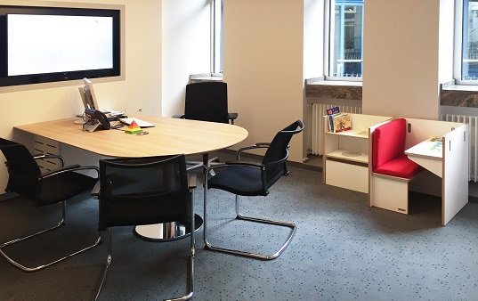 Durch die Auswahl der Polsterfarbe aus mehr als 20 Stoff-Farben und die Individualisierung des Plattenmaterials kann die Archipel-Spielecke ohne großen Kostenaufwand an das Corporate Design des Unternehmens angepasst werden.